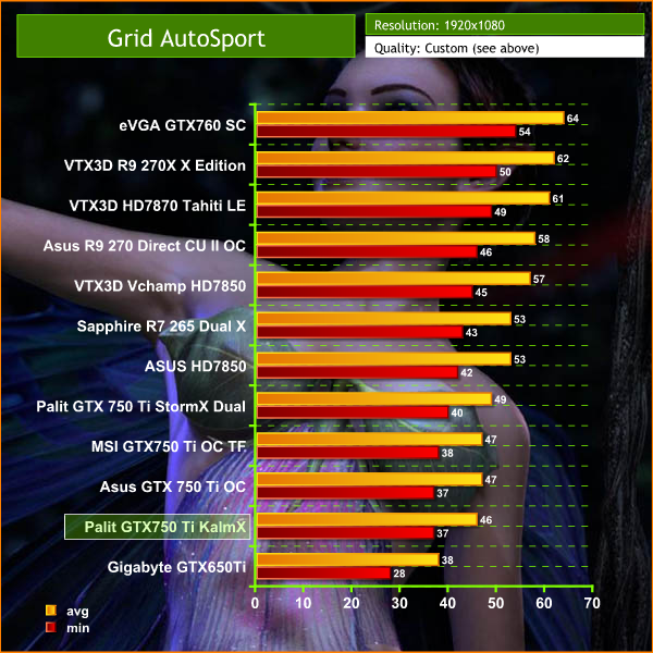 The Palit GTX750 Ti KalmX performs well at 1080p, holding a frame rate well above 30 at all times.