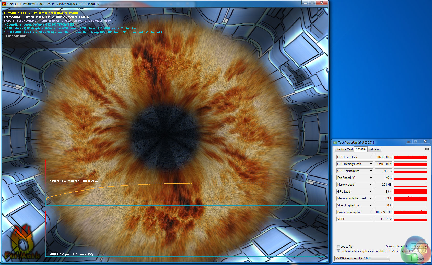 The tests were performed in a controlled air conditioned room with temperatures maintained at a constant 24c – a comfortable environment for the majority of people reading this.Idle temperatures were measured after sitting at the desktop for 30 minutes. Load measurements were acquired by playing Crysis Warhead for 30 minutes and measuring the peak temperature. We also have included Furmark results, recording maximum temperatures throughout a 30 minute stress test. All fan settings were left on automatic.
