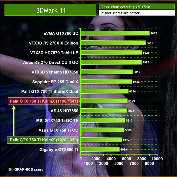 The manual overclock helps boost performance significantly in 3DMark 11, pushing the card to around mid table.