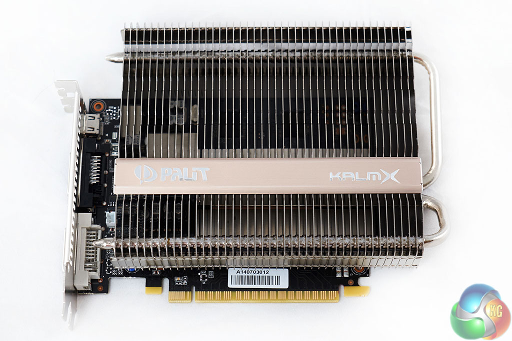 No fans anywhere in sight. And no noise either. A nice combination we don't often see. The Palit GTX750 Ti KalmX is actually a very attractive looking graphics card. The giant heatsink has a gold bar running along the lower area, with the name highlighted. The PCB is black, keeping in style with the understated aesthetic.