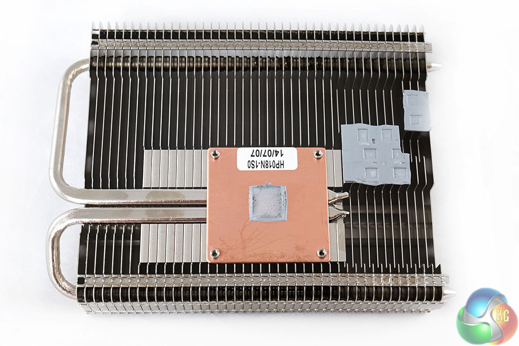 The heatsink is easy to remove, and there are no headers or cables to get in the way either. The cooler is large, but the design is simple enough. A copper base is connected to two heatpipes which run into large racks of aluminum fins on either side of the core.