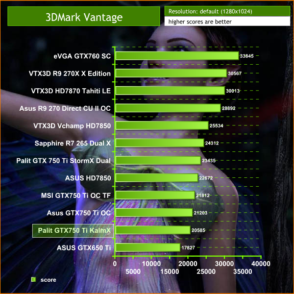 The Palit GTX750 Ti KalmX scores well in this older Direct X 10 benchmark, claiming a final score of 20,585 points.