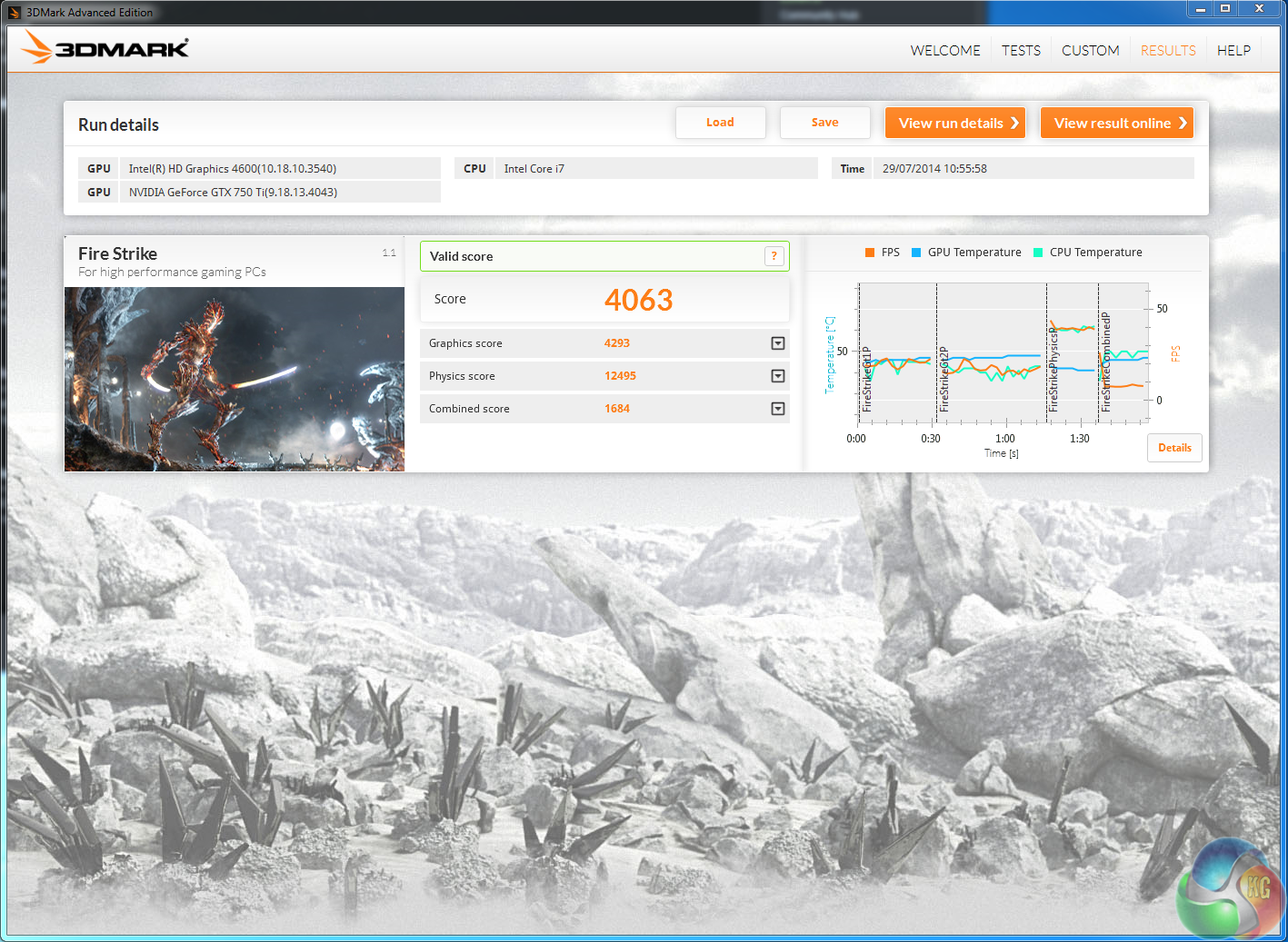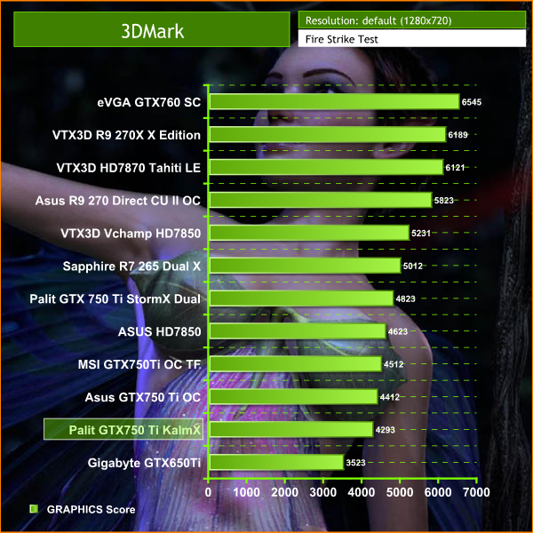 The latest version of 3DMark is a demanding Direct X 11 test. The Palit GTX750 Ti KalmX scores well considering the price point, claiming a final score of 4,293 points.