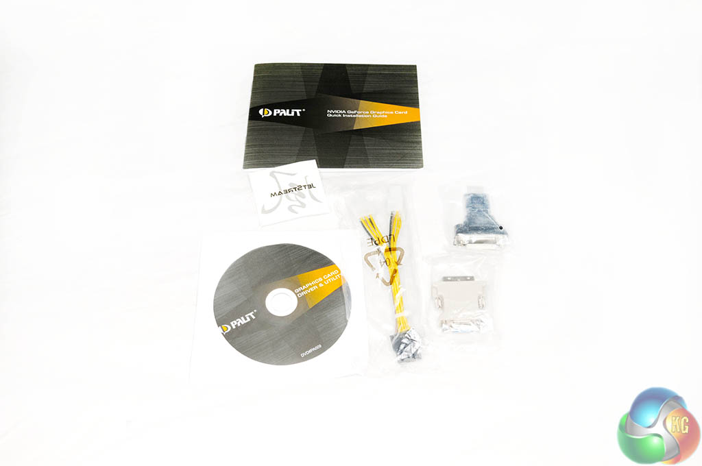 Inside the box is a power converter cable and two video converters. Palit include literature on the product, alongside a software disc.