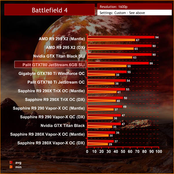 We test at 2560×1600 with the image quality settings on the ‘ULTRA’ preset. We test the AMD hardware with both Direct X and AMD’s Mantle rendering. Nvidia hardware is tested with Direct X rendering.