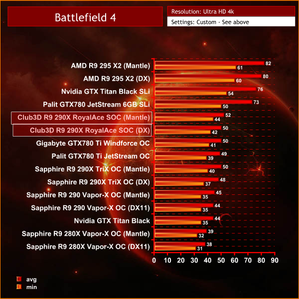 We dropped the image quality settings a little at Ultra HD 4K and all of the hardware on test manage to maintain 30+ frame rates. The AMD R9 295X2 card is way out in front in our tests, although the Palit GTX780 JetStream 6GB in SLi score very well – averaging 73 frames per second.