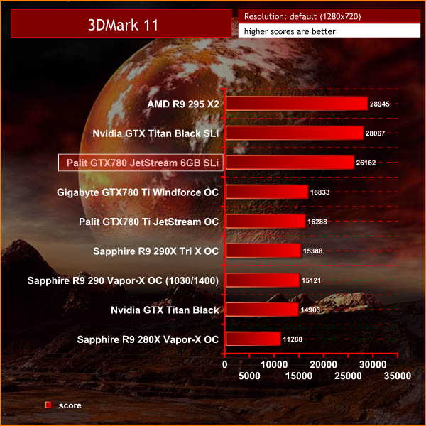 The graphics score of 26,162 points places the Palit GTX780 JetStream 6GB SLi configuration in third place, around 2,000 points behind the Titan Black in SLi.