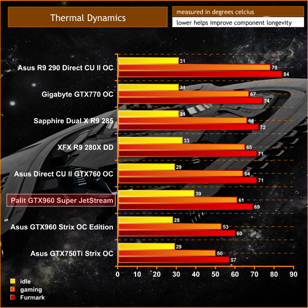 The Maxwell architecture shines in this test although I was surprised to see the Palit card running quite a bit hotter than the ASUS GTX960 Strix OC Edition, between 8 and 9 degrees Celsius which is certainly noticeable.