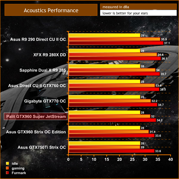 We measure from a distance of around 1 meter from the closed chassis and 4 foot from the ground to mirror a real world situation. Ambient noise in the room measures close to the limits of our sound meter at 28dBa. Why do this? Well this means we can eliminate secondary noise pollution in the test room and concentrate on only the video card. It also brings us slightly closer to industry standards, such as DIN 45635.