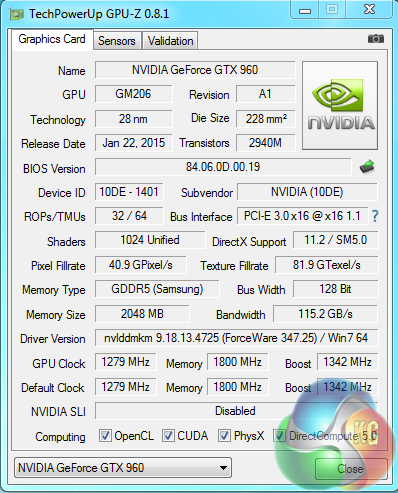 Based on the reference Nvidia specifications of 1,125mhz (core) and 1,750mhz memory (7Gbps effective) Palit have overclocked the GM206 core by 13.7 percent to 1,279mhz. They have even tweaked the memory by 50mhz, to 1,800mhz (7.2Gbps effective). The rest of the hardware we have already discussed on the opening page of this review. The GM206 is built on the 28nm process and it has 32 ROPS, 64 texture units and 1,024 CUDA cores. The 2GB of GDDR5 memory is connected via a 128bit memory interface.