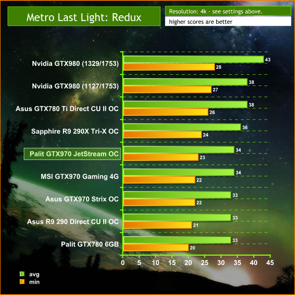 On May 22, 2014, a Redux version of Metro Last Light was announced. It was released on August 26, 2014 in North America and August 29, 2014 in Europe for the PC, PlayStation 4 and Xbox One. Redux adds all the DLC and graphical improvements. A compilation package, titled Metro Redux, was released at the same time which includes Last Light and 2033. (Wikipedia). We test with following settings: Quality-High, SSAA-off, Texture Filtering-16x, Motion Blur-off, Tessellation-Normal, Advanced Physx-off.