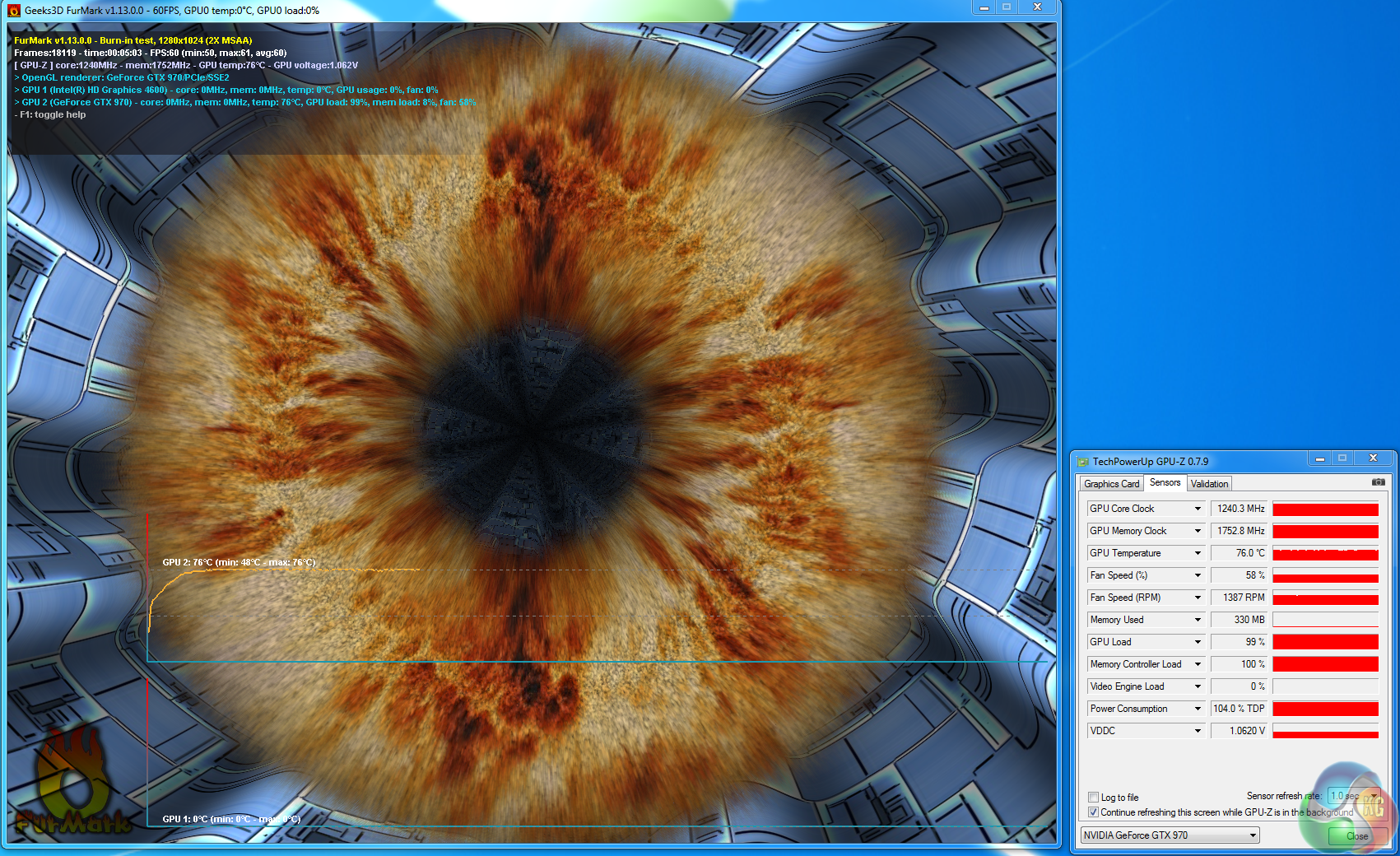 The cooler is falling quite a distance behind the Twin Frozr5 on the MSI GTX970 Gaming 4G and the Direct CU II cooler on the Asus Strix OC. The fans only spin at 1,200rpm when gaming in Tomb Raider and 1,400rpm under Furmark load.
