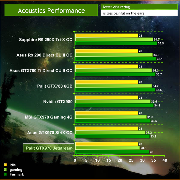 We measure from a distance of around 1 meter from the closed chassis and 4 foot from the ground to mirror a real world situation. Ambient noise in the room measures close to the limits of our sound meter at 28dBa. Why do this? Well this means we can eliminate secondary noise pollution in the test room and concentrate on only the video card. It also brings us slightly closer to industry standards, such as DIN 45635.