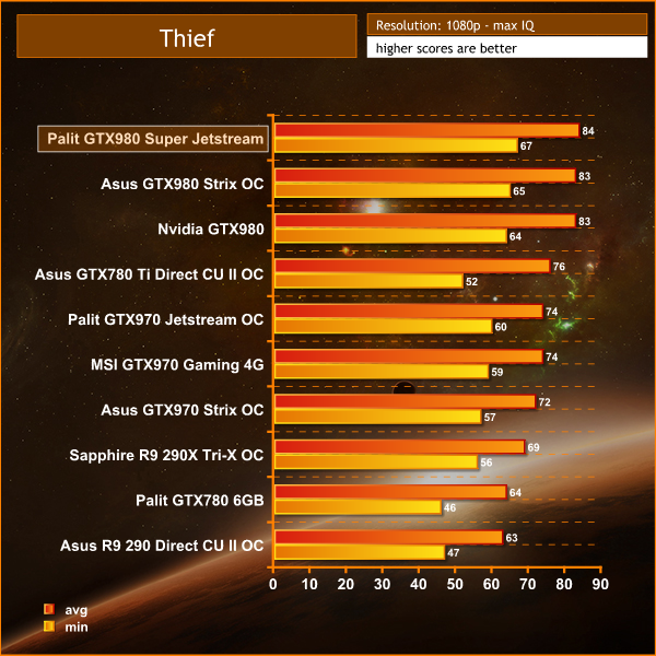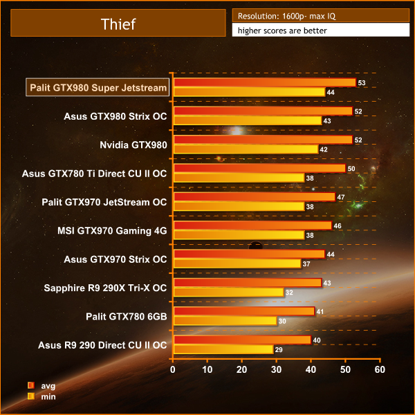 Thief is a demanding engine, although no problems for the Palit GTX980 Super JetStream, holding smooth frame rates at both 1080p and 1600p resolutions.