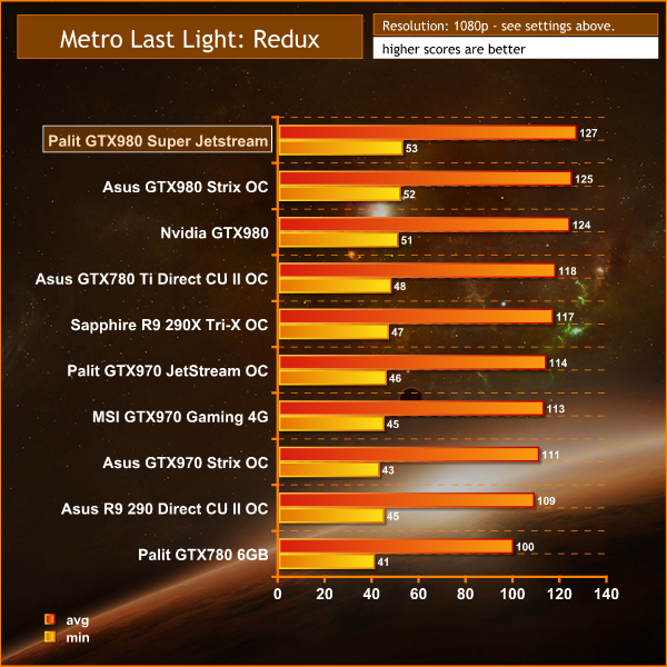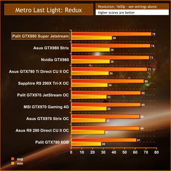On May 22, 2014, a Redux version of Metro Last Light was announced. It was released on August 26, 2014 in North America and August 29, 2014 in Europe for the PC, PlayStation 4 and Xbox One. Redux adds all the DLC and graphical improvements. A compilation package, titled Metro Redux, was released at the same time which includes Last Light and 2033. (Wikipedia). We test with following settings: Quality-Very High, SSAA-off, Texture Filtering-16x, Motion Blur-Normal, Tessellation-Normal, Advanced Physx-On.