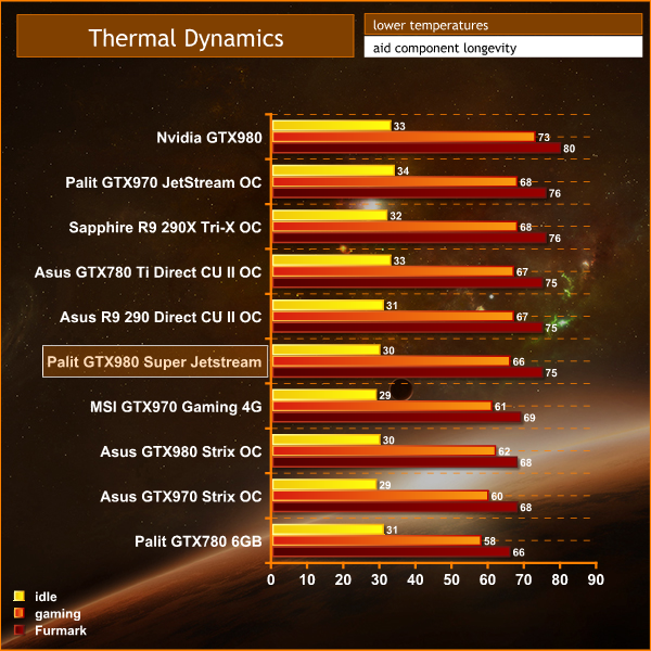 The Palit GTX980 Super JetStream cooler isn't quite as good as the latest Direct CU cooler, fitted to the Asus GTX980 Strix. It holds gaming temperatures around the 65-66c mark which is 7c cooler than the reference GTX980.