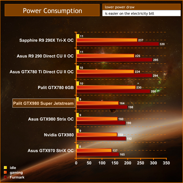 The GTX980 cards are very efficient, thanks to the advancements with the Maxwell architecture. The Palit GTX980 Super JetStream consumes around 164 watts under gaming load, which is around 4 watts more than the Asus GTX980 Strix OC.