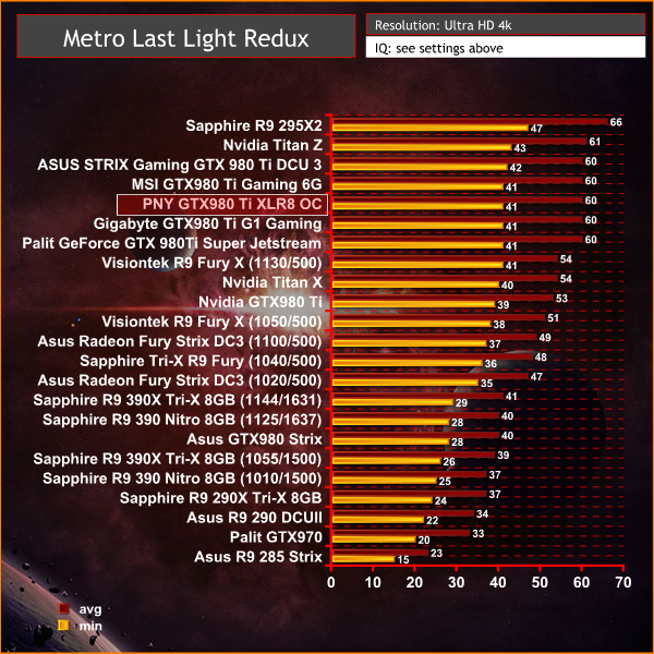 On May 22, 2014, a Redux version of Metro Last Light was announced. It was released on August 26, 2014 in North America and August 29, 2014 in Europe for the PC, PlayStation 4 and Xbox One. Redux adds all the DLC and graphical improvements. A compilation package, titled Metro Redux, was released at the same time which includes Last Light and 2033. (Wikipedia). We test with following settings: Quality- High, SSAA-off, Texture Filtering-16x, Motion Blur-Normal, Tessellation-Normal, Advanced Physx-off.