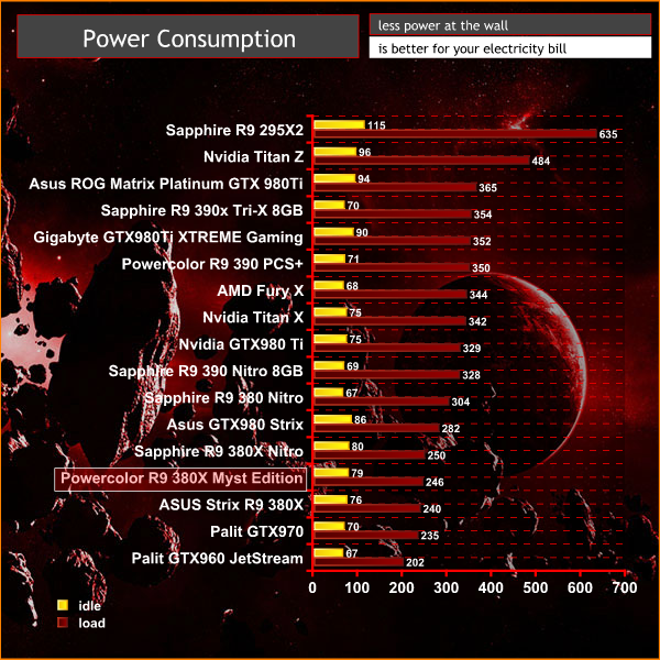 The Powercolor R9 380X Myst Edition consumes a little less power than the Sapphire R9 380X Nitro – around 4 watts under similar load situations.