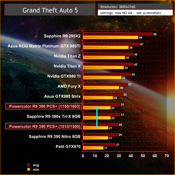 Grand Theft Auto V benefits from a good SLI or Crossfire configuration at Ultra HD 4K resolutions. The R9 390 struggles to maintain a solid 30 frames per second at these settings.