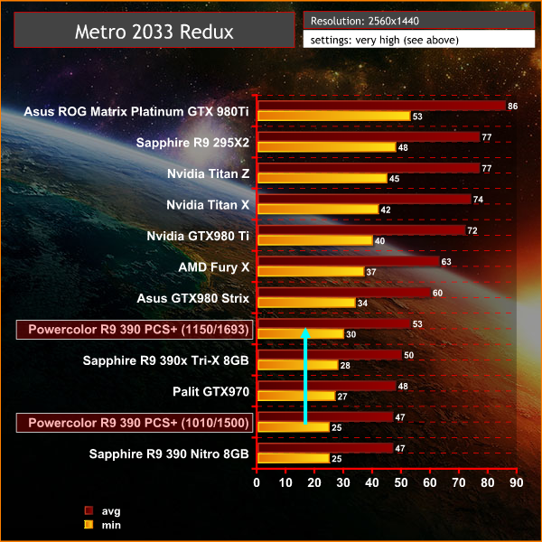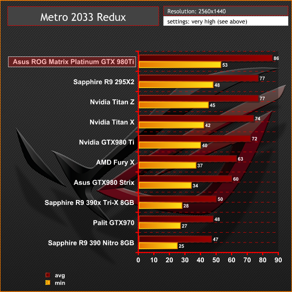 Metro 2033 Redux is a remake of the original game, with enhanced graphics. We often test with Metro Last Light Redux, but decided to mix things around for this review today. We test at 2560×1440 with the following settings: Quality-Very High, SSAA-off, Texture Filtering-16x, Motion Blur-Normal, Tessellation-Normal, Advanced Physx-off.