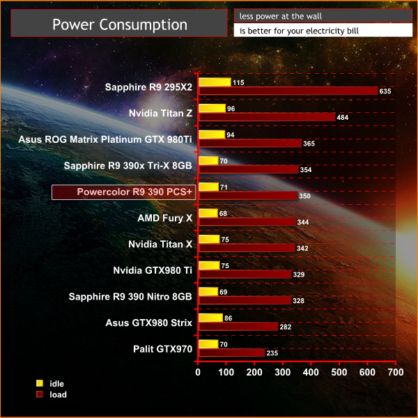 The PowerColor Radeon R9 390 PCS+ consumes more power than the reference design, with the system demanding around 350 watts under load. By comparison the Sapphire R9 390 Nitro 8GB demands around 20 watts less.
