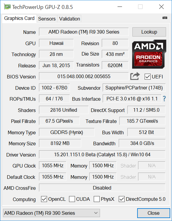 Sapphire R9 390 Nitro 8GB (1,010 mhz core / 1,500 mhz memory)