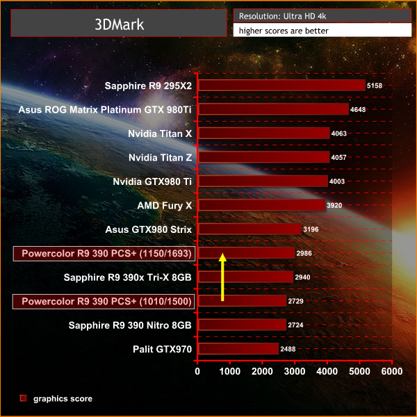 At Ultra HD 4K resolution, the PowerColor Radeon R9 390 PCS+ is around 200 points behind the R9 390X. When overclocked to the limit it manages to slightly outperform the reference clocked R9 390X.