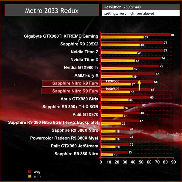 At 1440p the Fury averages around 60 frames per second with an increase of 4-5 fps when manually overclocked.