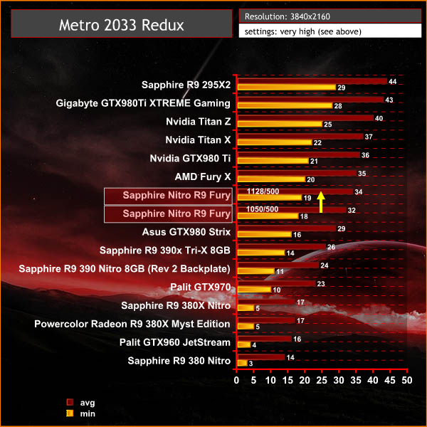 A tough order at 4k – with frame rates dropping into what we would consider unplayable zones. That said, the R9 Fury manages to outperform the Asus GTX980 Strix. A drop of image quality settings would help raise the minimum frame rates.