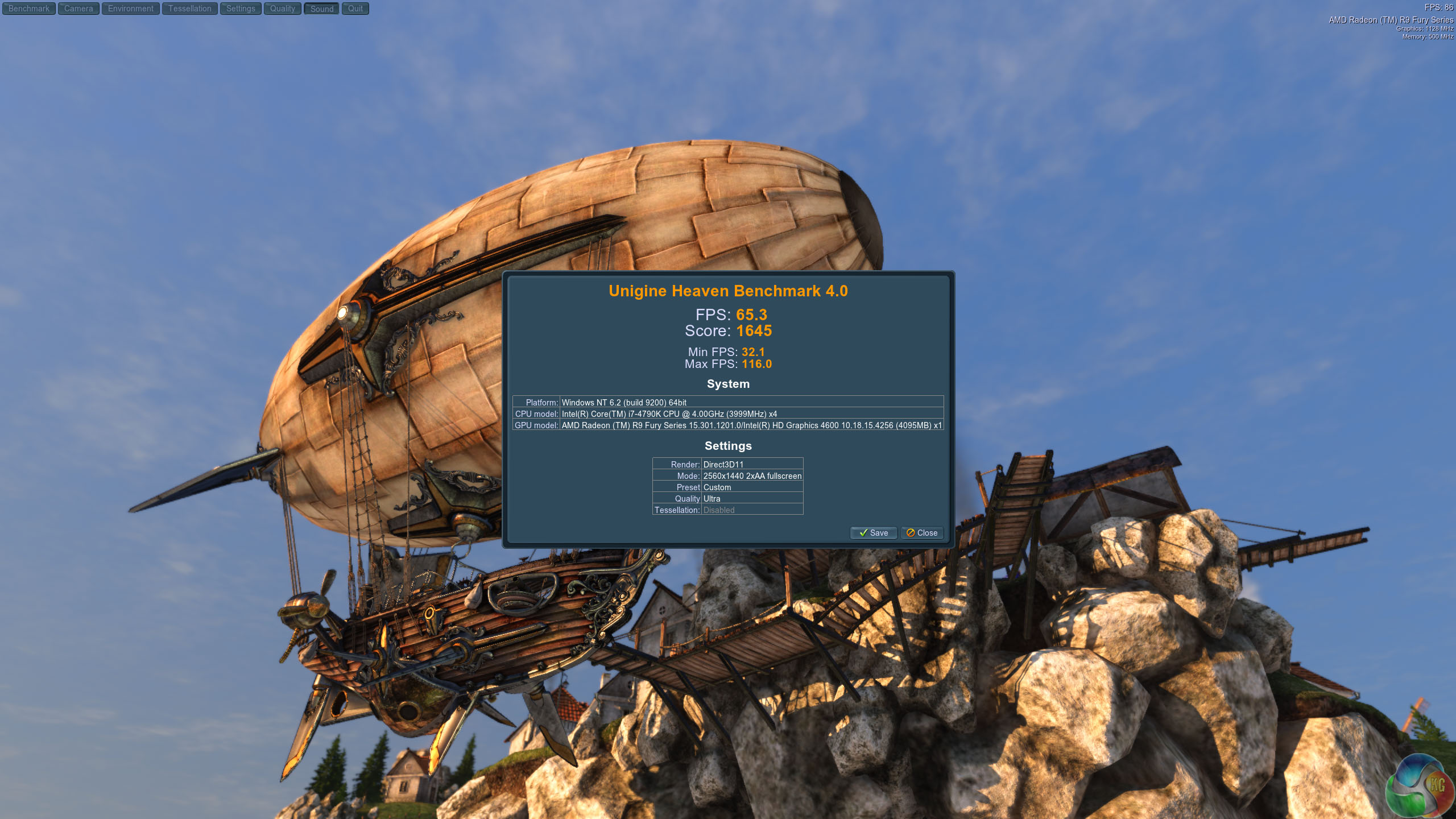 We test at 2560×1440 with quality setting at ULTRA, Tessellation at NORMAL, and Anti-Aliasing at x2.