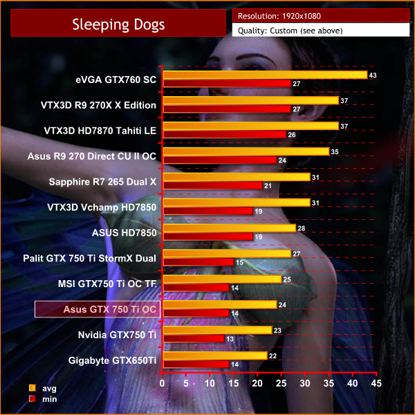 None of the cards are really able to handle such high image quality settings, even at 720p. The eVGA GT650 slightly outperforms the Sapphire R7 250 Ultimate however, with a 3 frames per second average advantage.