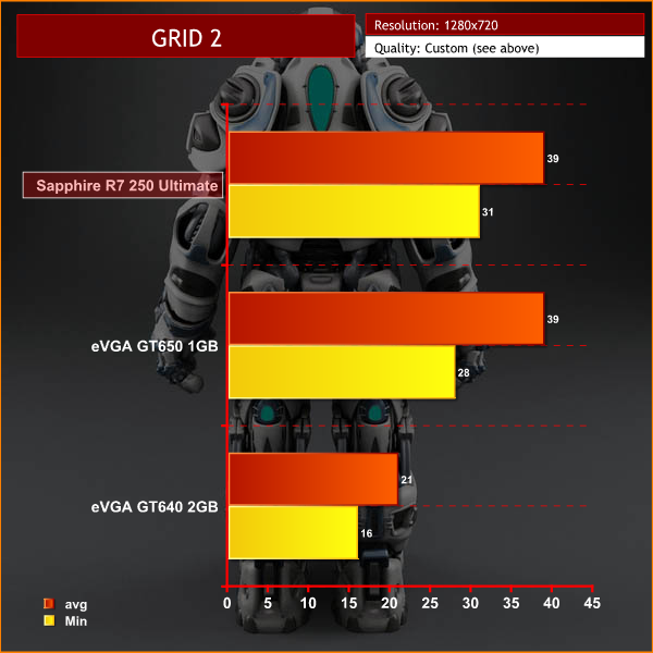 The Sapphire R7 250 scores well with this engine, averaging 39 frames per second.