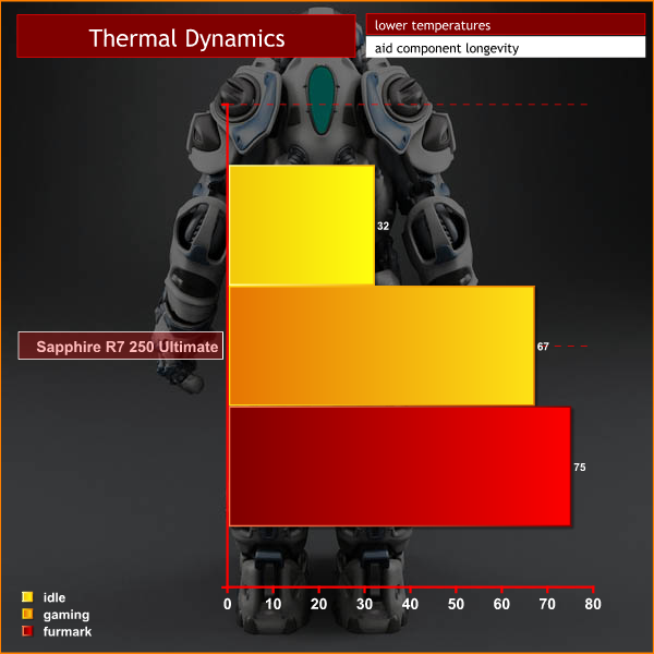 As the Sapphire R7 250 Ultimate is a fan-less solution, we had to stress the card for a long time to see how the cooler handled with continued heat from the core. It peaked at 67c when gaming, and 75C when under Furmark load. These are good results.