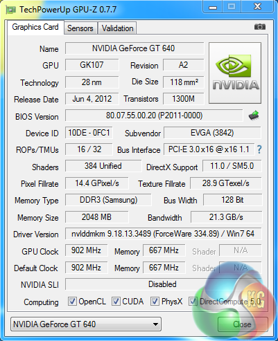eVGA GTX640 2GB (902mhz core / 667 mhz memory) – Forceware 334.89. £79.65 inc vat.