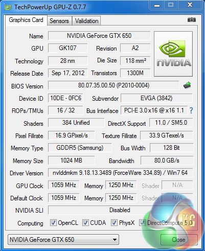 eVGA GTX650 1GB (1059mhz core / 1,250 mhz memory) – Forceware 334.89. £64.96 inc vat