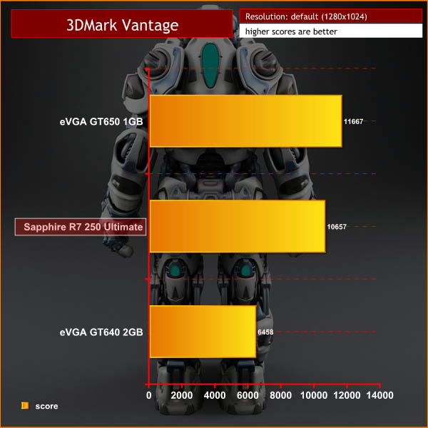 The eVGA GT650 1GB leads this particular benchmark, scoring 11,667 points. The Sapphire R7 250 Ultimate isn't too far behind, scoring 10,657 points. The GT640 2GB trails the pack, scoring a measly 6458 points.
