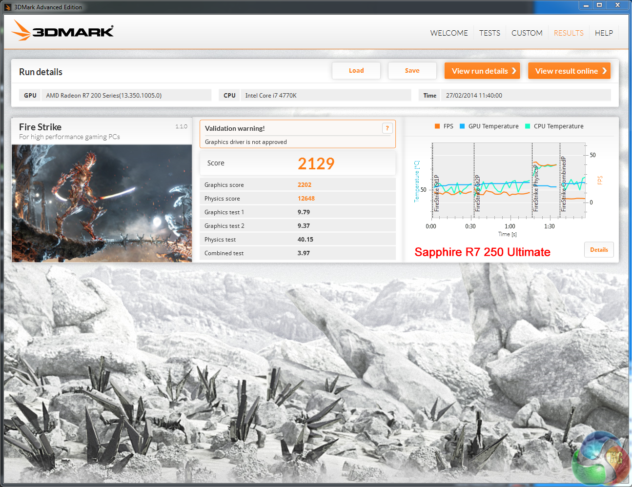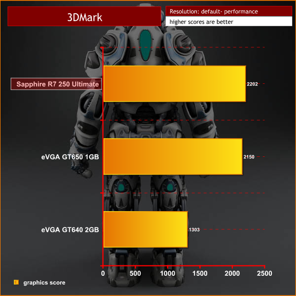 Very closely matched between the Sapphire R7 250 Ultimate, and the eVGA GT650, scoring 2,202 and 2,150 points respectively.