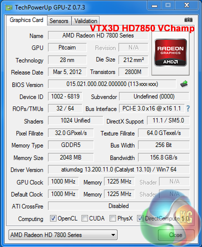 Above, the GPUz screenshot from our VTX3D VChamp HD7850 review from last October. We can see the same PitCairn core built on the 28nm engineering process. Both cards have 32 ROP's and 64 texture units. The older VTX3D VChamp HD7850 is however clocked higher, at 1000mhz.