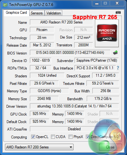 The Sapphire R7 265 which we received for this review is not in an overclocked state although it is using high grade SKHynix memory clocked at 1,400mhz (5.6Gbps effective).