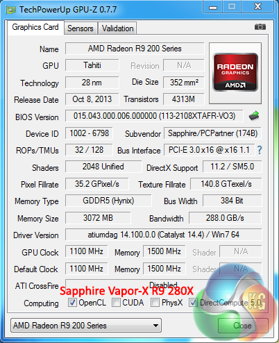 The Sapphire R9 280X Vapor-X ships with a core clock speed of 1,100mhz and the GDDR5 memory is clocked at 1,500 mhz (6Gbps effective), connected via a 384 bit memory interface. The R9 280X has 32 ROP's, 128 Texture units and 2,048 unified shaders.