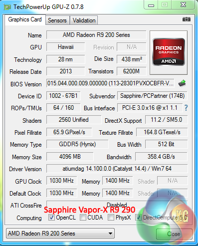 The Sapphire R9 290 Vapor-X ships with a core clock speed of 1,030mhz and the GDDR5 memory is clocked at 1,400mhz (5.6Gbps effective), connected by a 512 bit memory interface. The R9 290 has 64 ROPS, 160 texture units and 2,560 unified shaders.