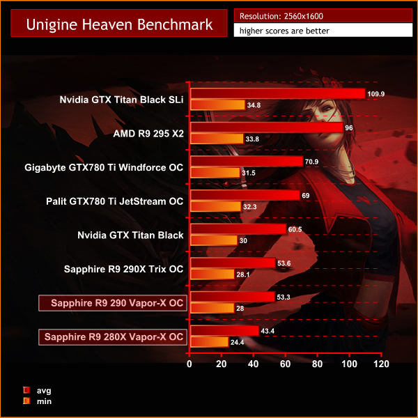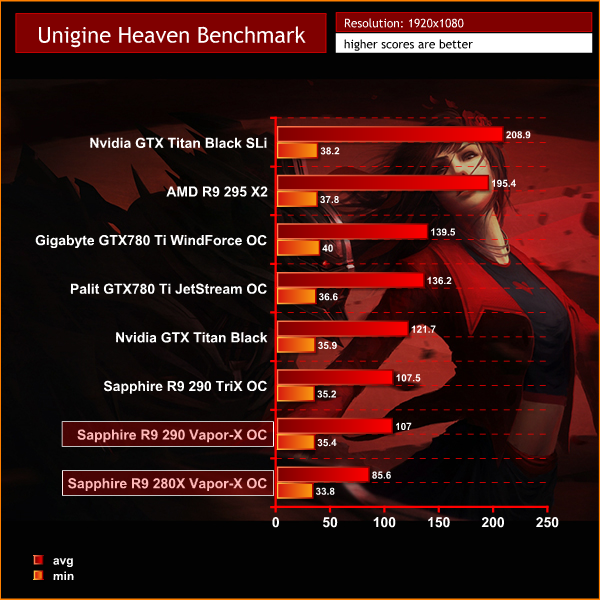 I’m actually surprised by the 1920×1080 results just ran my Powercolor PCS+OC R9 290 through the same test Ultra preset AA 4x and Tesselation off my results were as follows (were any of your settings different?):