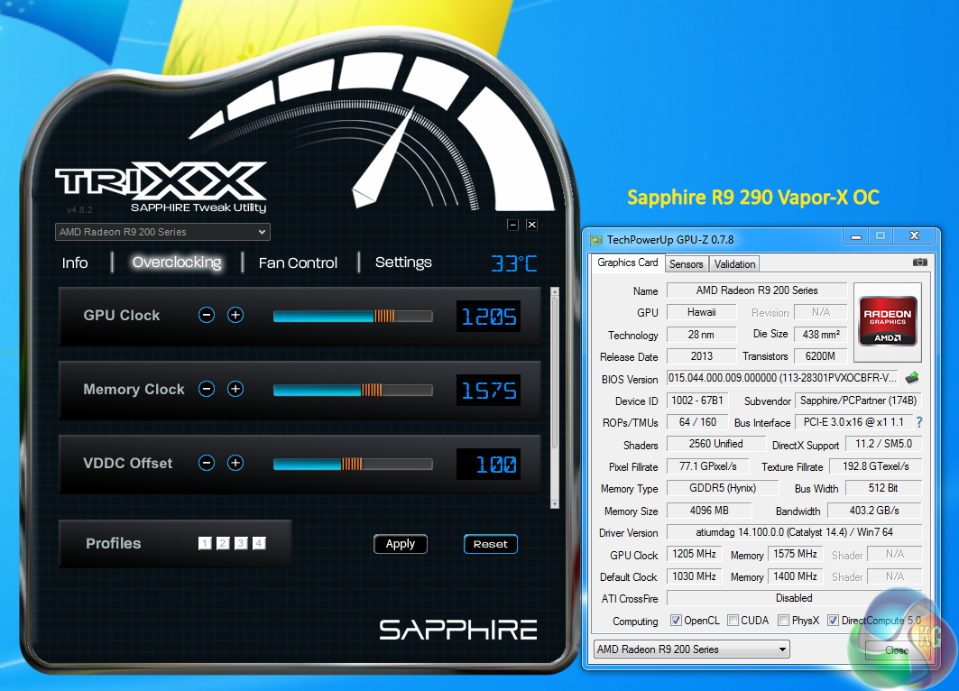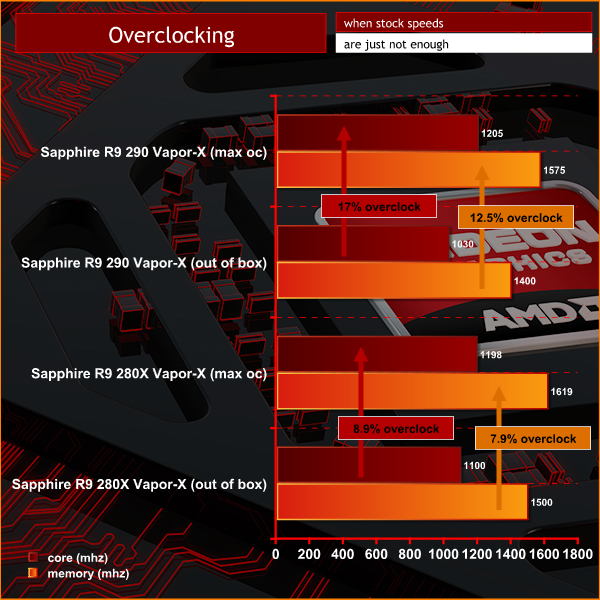 The Sapphire R9 290 Vapor-X OC responds well to overclocking, hitting an additional 17% manual increase with some voltage changes. This took the core speed from 1,030 mhz to 1,205 mhz. The Sapphire R9 280X Vapor-X OC was able to run stable with a 9% overclock to 1,198mhz.