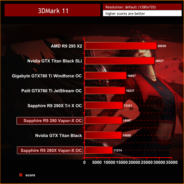 The Sapphire R9 290 Vapor-X OC is an exceptional performer, actually outperforming the reference clocked Nvidia GTX Titan Black in this Direct X 11 benchmark.