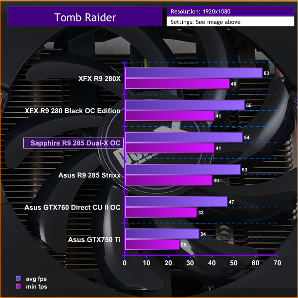 The game plays great on the R9 280 and R9 285 cards, averaging well over 35 frames per second at all times.