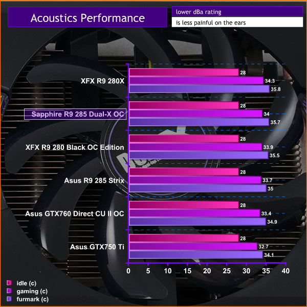The Dual-X cooler maintains a low acoustic emission, rising to 34dBa when gaming. The pitch of the fans a little higher than the fans on the Asus Strix card, so they are a little more noticeable. Still, good results.