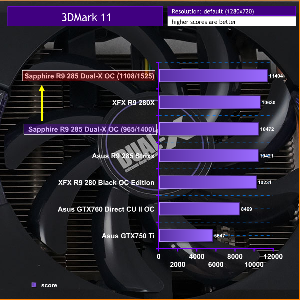 The final graphics score of 11,404 places the manually overclocked Sapphire R9 285 Dual-X OC well in advance of the default clocked XFX R9 280X.