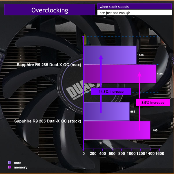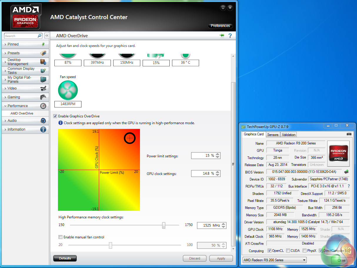 The card responded very well to overclocking – hitting 1,108mhz (14.8%) before instability would occur. This is around 50mhz more than the ASUS R9 285 Strix sample which we reviewed earlier this week.