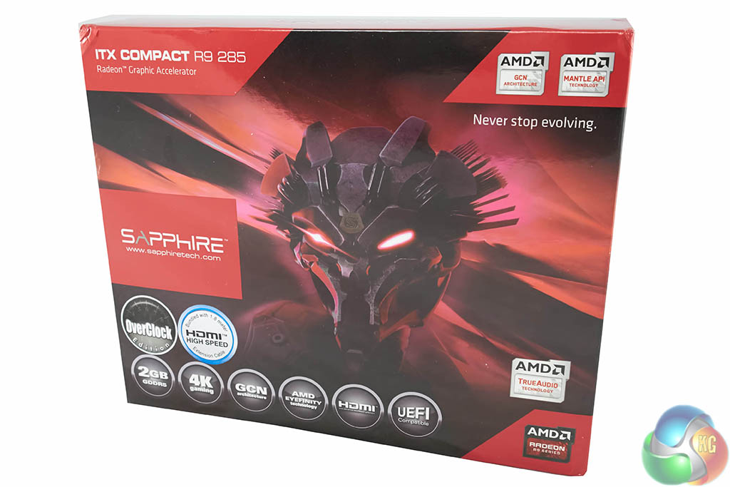 The Sapphire R9 285 ITX Compact box artwork is the stuff of nightmares. Not the kind of chap you would want to meet in a dark alleyway at night.